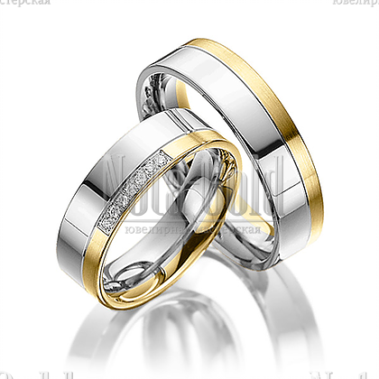 Классические обручальные кольца прямоугольного профиля из белого и желтого золота с продольной полоской бриллиантов в женском кольце