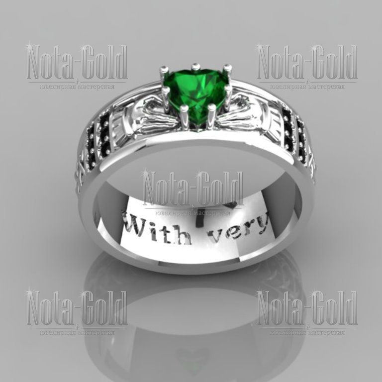 Кладдахское кольцо из белого золота с гравировкой и изумрудом в форме сердечка (Вес: 5 гр.)гр.)