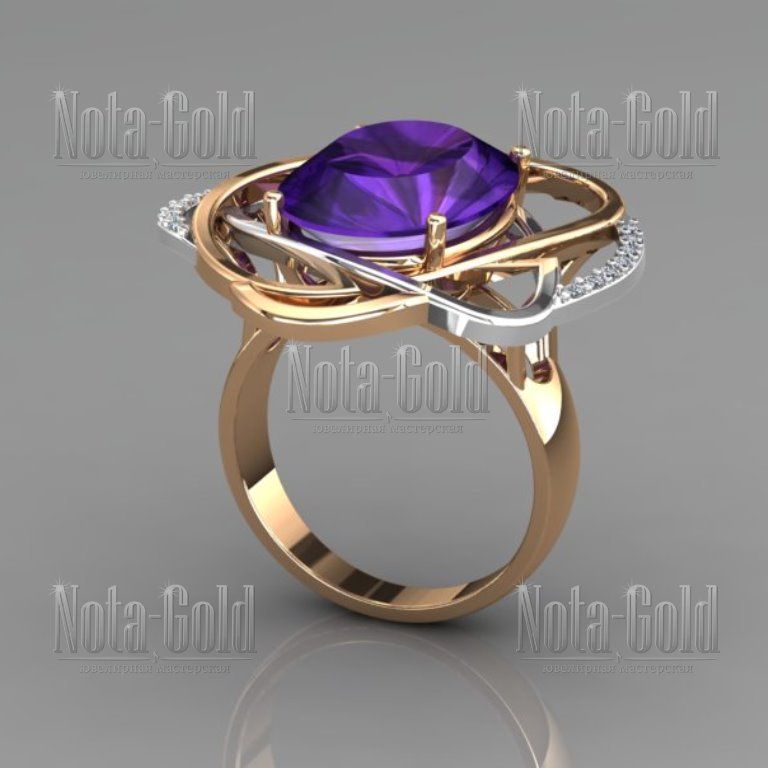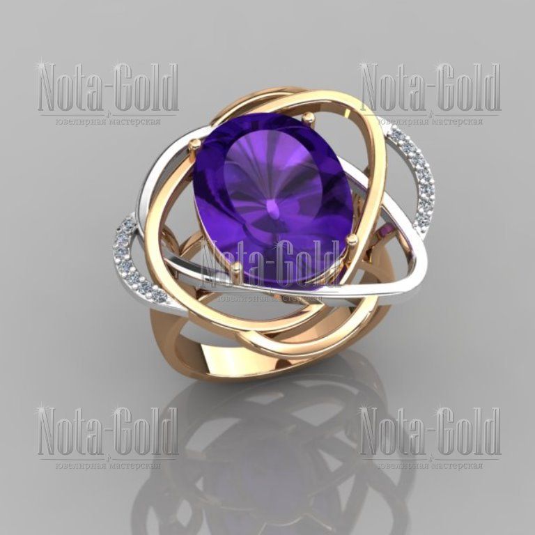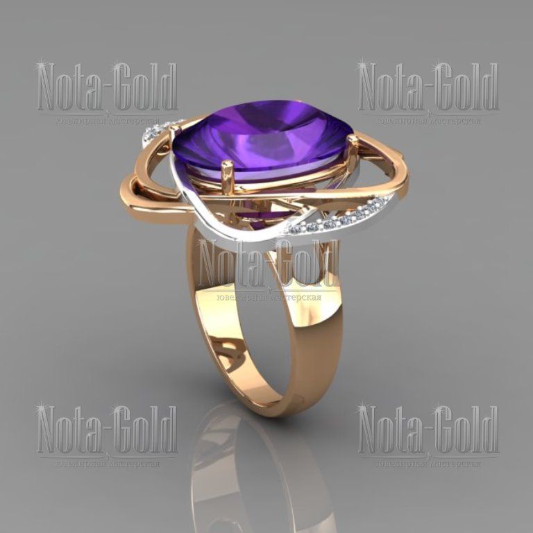 Женское кольцо из золота двух цветов с бриллиантами и крупным аметистом (Вес: 9,5 гр.)